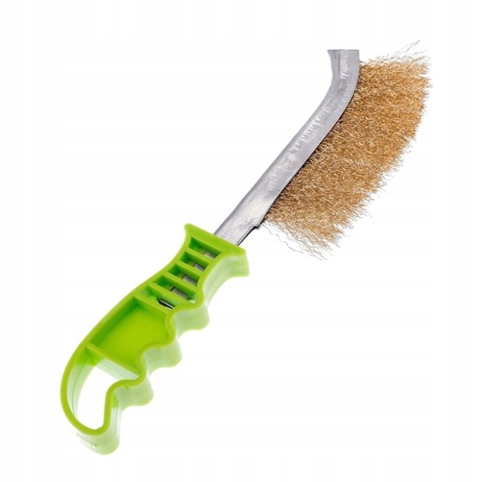 Szczotka wykonana z karbowanego, mosiężnego drutu. Polecana do czyszczenia uporczywych zabrudzeń, rdzy, farb, wygładzania metali, kamieni, tworzyw sztucznych i krawędzi. Posiada ergonomiczny, wykonany z tworzywa sztucznego uchwyt z otworem.