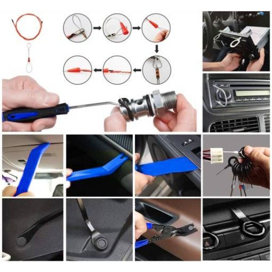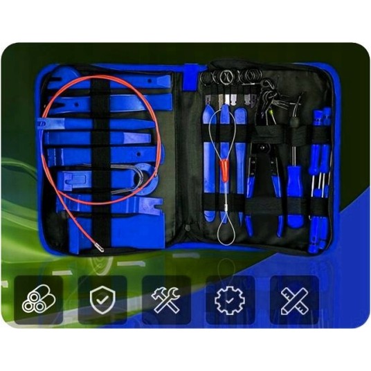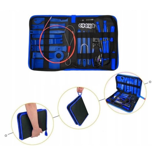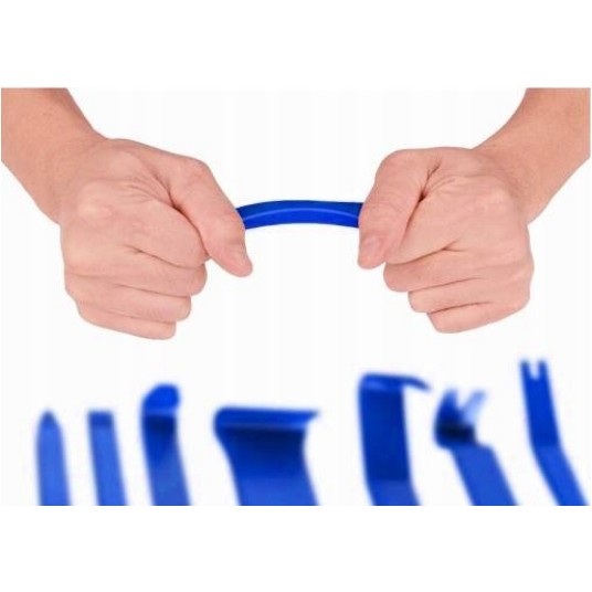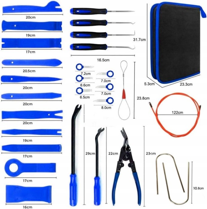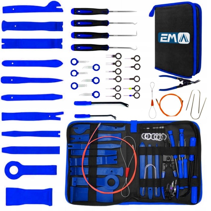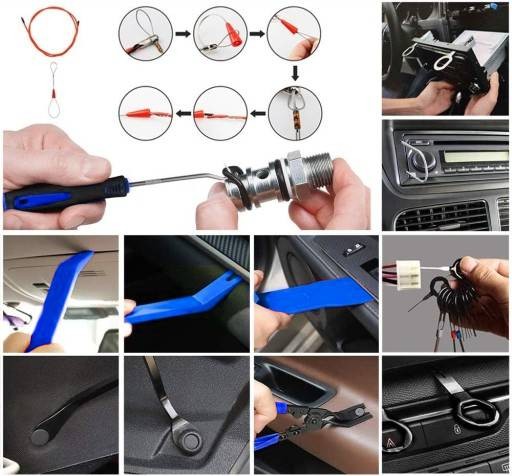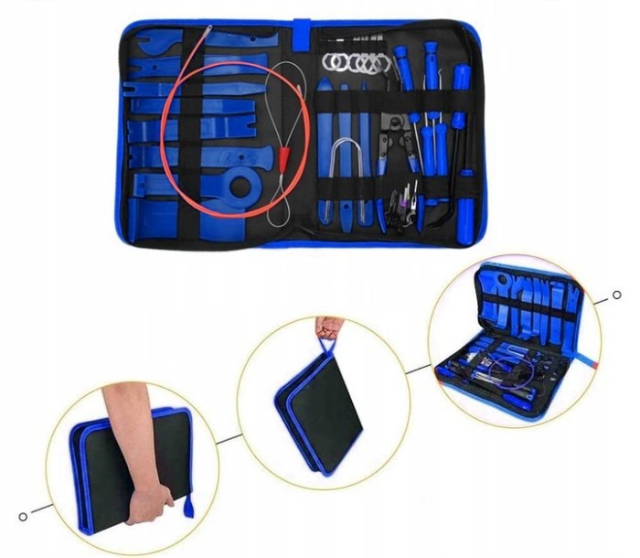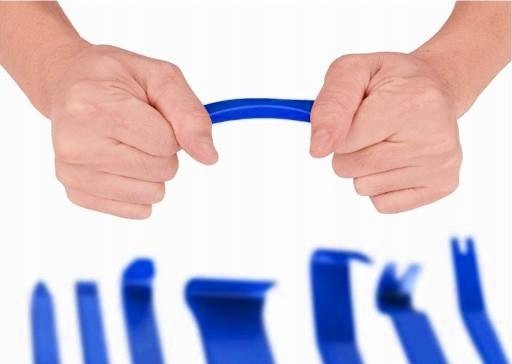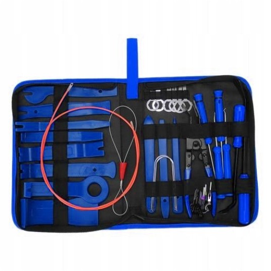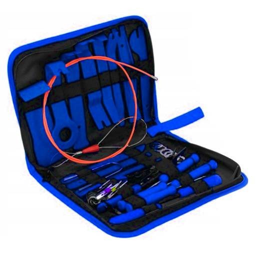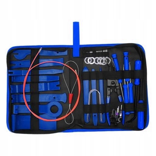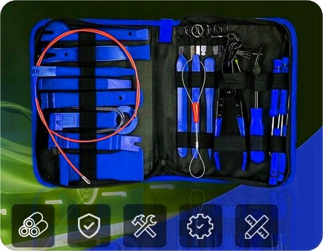 Zestaw narzędzi do demontażu samochodów służący m.in. do demontażu radia, nawigacji, listew i tapicerki.
